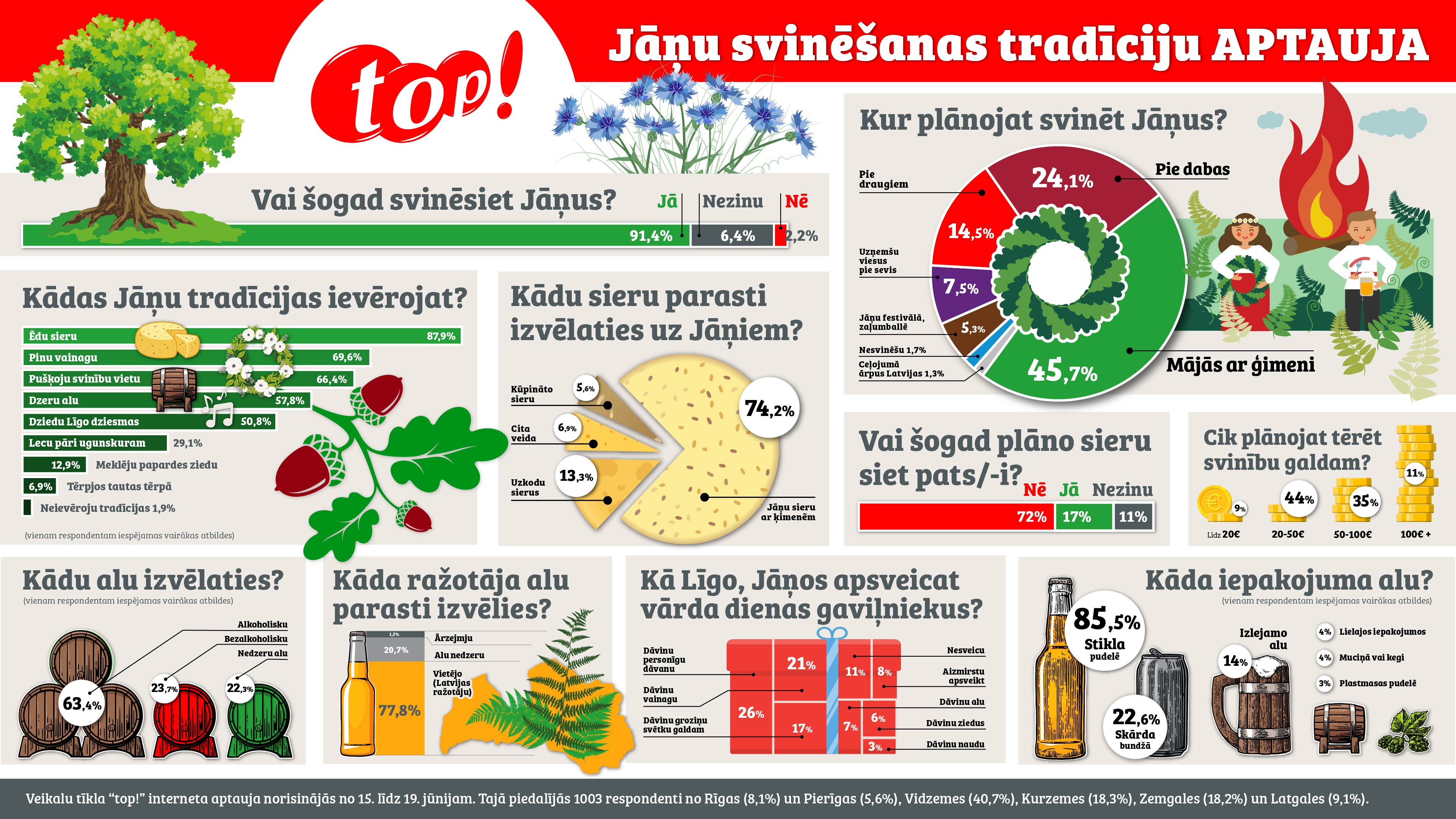 The annual survey conducted by the store chain top! on Midsummer Day celebration customs affirms that Midsummer Day (Jāņi) continues to be the most widely celebrated folk holiday. Based on the findings of a top! survey conducted a few years ago, a significant majority of respondents, 86%, acknowledged celebrating it. This year, the number has seen an increase, reaching 91.4%. Respondents have indicated that they have various plans for celebrating during the upcoming public holidays. The majority of them (45.7%) intend to spend time with their family, while 24.1% prefer to enjoy the outdoors. Additionally, 14.5% plan to celebrate with friends, and 5.3% are looking forward to attending a festival or a Midsummer Day open-air party. In line with long-standing traditions, survey participants expressed their intentions to indulge in cheese (87.9%), enjoy beer (57.8%), gather Midsummer herbs and create wreaths (69.6%), adorn the festive location (66.4%), sing Līgo songs (50.8%), and partake in activities such as searching for a fern flower, dressing up in folk costumes, and leaping over a bonfire.