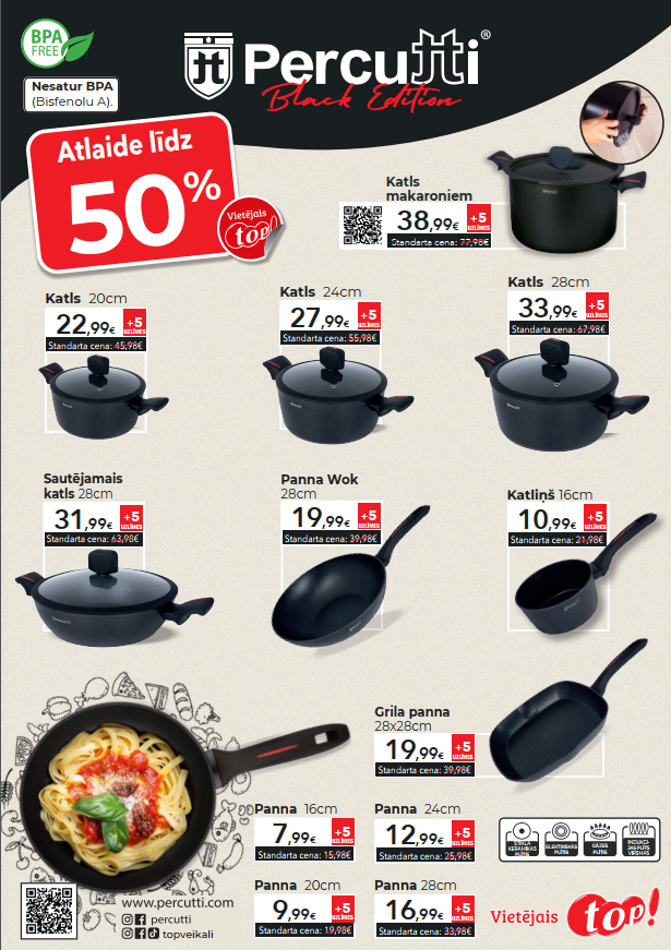 PERCUTTI uzlīmju krāšanas kampaņa ir klāt! Šīs vasaras jaunā misija – izcilība tavā virtuvē! Iepērcies vietējā top!. No 05.05.2022. līdz 27.07.2022. krāj uzlīmes un saņem atlaidi līdz 50% jaunajiem, nepiedegošiem un videi draudzīgiem augstākās kvalitātes spāņu traukiem -Percutti Black edition! Adios, vecie katli un pannas! Esi sveicināta – izcilība virtuvē!